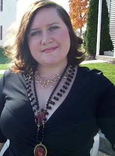Option #3: "Latin flair" LBD with a bright red rosette at the waist. I kept the gold chain link necklace on as well. This is a fun option because of the pop of color, It draws the eye to the smallest part of my body- my waist- so it actually helps the shape of the dress to flatter me even more. I kept the shoes a basic black to keep the eye from having to jump around. If the shoes were a bright color, too, the accessories could cancel each other out by forcing the eye to two different places.