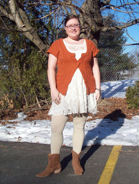 I struggled choosing the right tights- first I tried cream, but that was way too much. I experimented with black and brown, both of which were just too dark, although the brown definitely worked better than the black. Finally, I settled on the beige "sweater" tights that unfortunately are a smidge too big and tend to bunch around my knees. The whole outfit was put together because I really wanted to wear my cowboy boots, so maybe I don't love it because it felt forced together. Do you ever feel that way? You really want to wear a certain item, but can't seem to put the right outfit together around it? In the end, I think this worked, but it's a little funky and out of the ordinary for me. It's a good thing to step outside of your comfort zone every now and then. It's also a good thing to know that not every outfit has to be a home run.